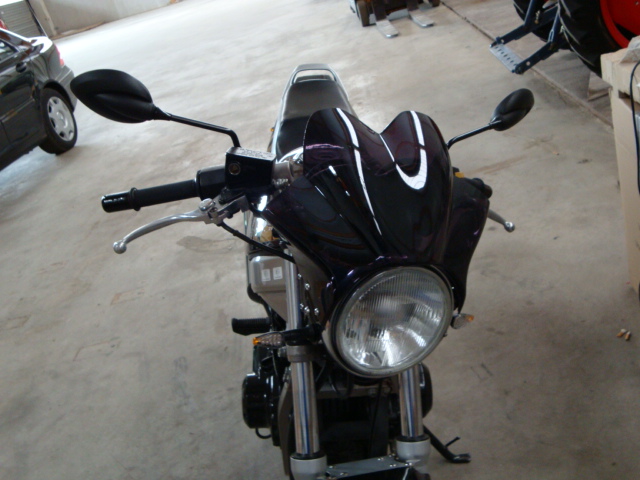 Der Lack ist orginal, ich hab nur die Afkleber weggemacht, weil sie pink waren/sind und die "GS 500 E" Aufkleber hinten verkratzt waren, da der Vorbesitzer sie zwei mal hat fallen lassen Bin mit Kunststoffreiniger, (Oliven-Öl) und Lack pflege nach dem Aufkleberentfernen drüber,...tada Die pinknen Aufkleber vorn bekomm ich nihct weg, Klarlack Wegen der Scheibe: - Ich hab den Fronscheinwerfer zerlegt - die 2 Schrauben gelöst - Scheiben-Halter mit der Scheibe verbunden und eingeschoben - die Pads an die Amatur geklebt - Scheibe an den Amaturen "angeleht" - die Schrauben fest gezogen (die Scheibe biegt sich dabei ein wenig, aber keine Angst, die hält das aus) - den Scheinwerfer wieder zusammen gesetzt (ist etwas knifflig, daman zum einfedeln kaum noch Platz hat) Ich finde den Windschutz im Verhältnis zur Größe Phänomenal!!! Und mir gefällt sie MfG Simon
