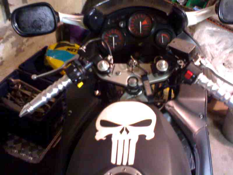 Ne Zeit voller Schweiß,Wut,Verzweiflung und Freude liegt hinter mir :kratz: .Naja ihr wißt schon.Eben grad noch das Problem mit dem elektrisch angesteuerten Drehzahlmesser gelöst.@Goose :3Kabel = plus,minus,geber-Ich Trottel :aua: Dann gings wies Katzen machen.Naja grad noch mitm Handy paar Bildchen geschossen.Ich weiß der Lack is nich hübsch aber erstens isser nur Übergangslösung und 2.kommen gleich noch paar schicke Punisher Skulls auf Tank und VVK.Vernünftig gelackt wird erst nach der Eintragung.Cockpit funzt nu reibungslos.Schläuche und Züge sind auch so platziert das sie nich hängen bleiben(Gott sei Dank)oder scheuern.Den Eingang f.d.Drehzahlmesserwelle hab ich erstmal verschlossen mit der alten gebrochenen Welle gekürzt und fixiert.Kommt kein Dreck rein und gibt hoffentl.keine Probleme.Ja der Wagner Höcker (mit Sitzpolster RGV)soll in d.kommenden Monaten nochmal überarbeitet werden und die angepaßten Halterungen nach und nach verstärkt so daß sie dem Graukittel hoffentl.genügen.So dann hier noch n paar leider unscharfe Bilder.Auf jeden Fall tut sichs fahren ohne böse auffe Schnauze zu fallen oder daß man während der Fahrt auf einmal wieder ne nackige Maschine hat