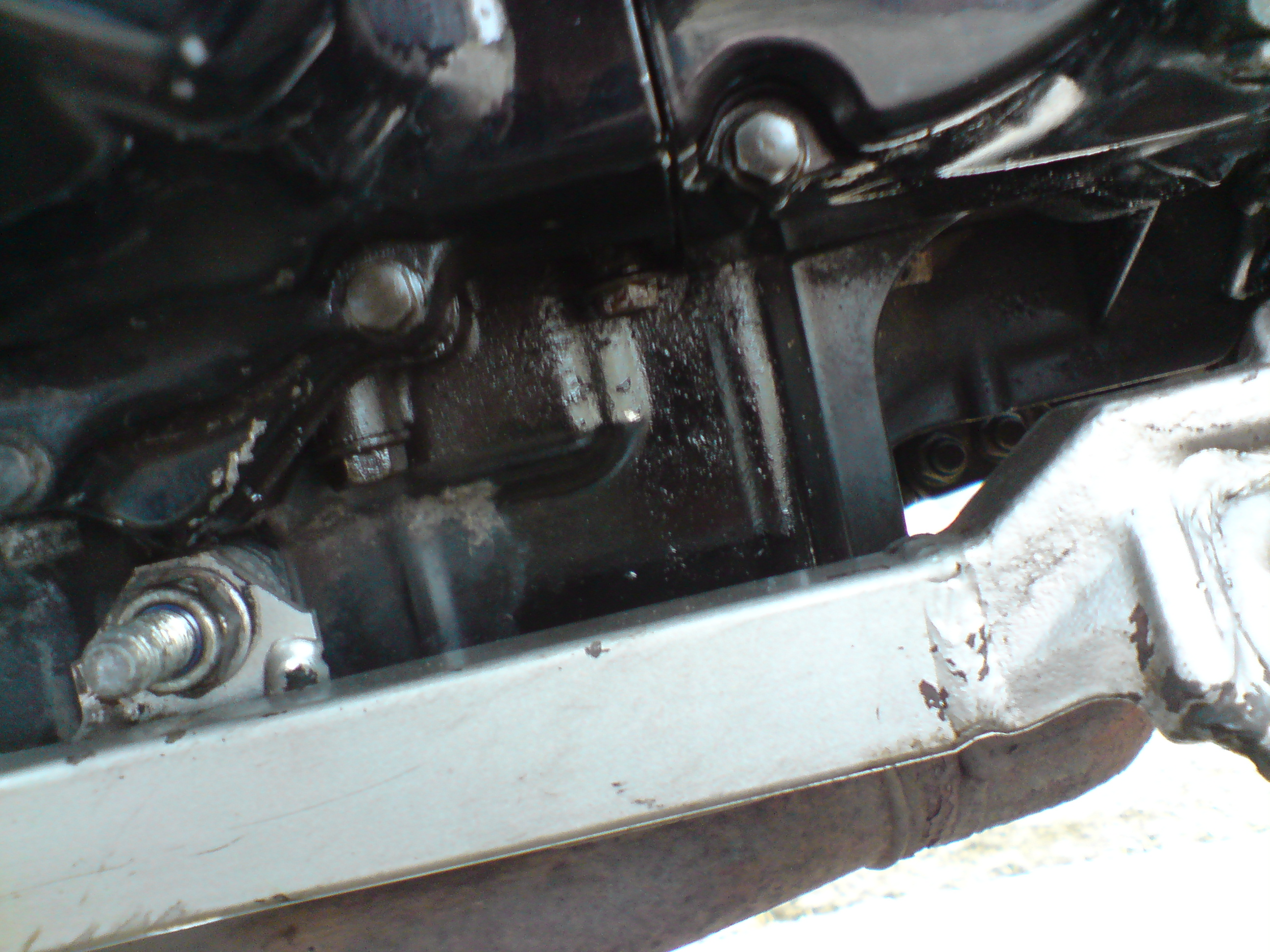 So mal 2 Fotos.. die ich gerade gemacht habe! Da läuft das Öl runter.. ist wie gesagt unter dem linken deckel... noch vor dem seitenständer.. hoffe man kann es ganz gut erkennen!
