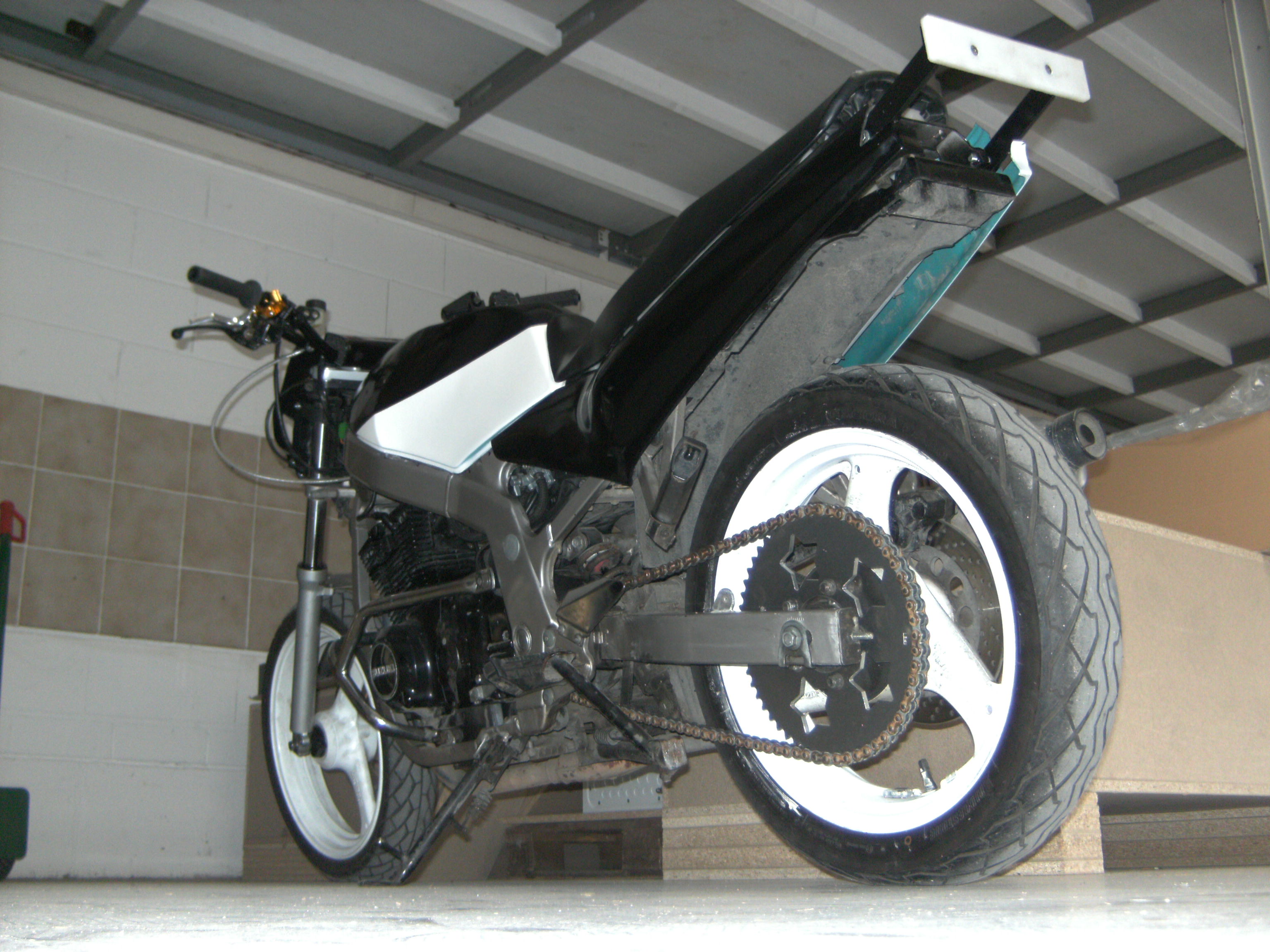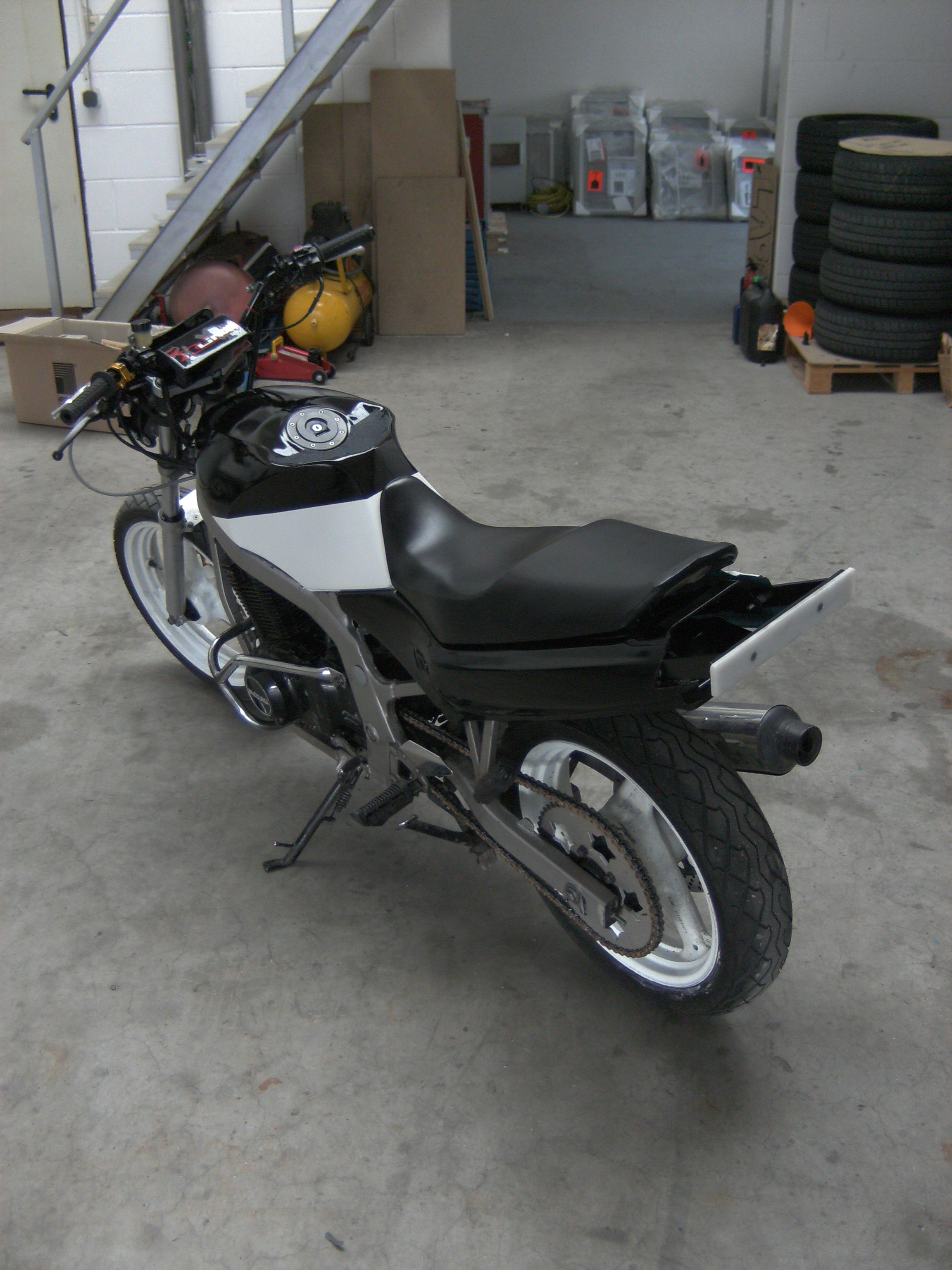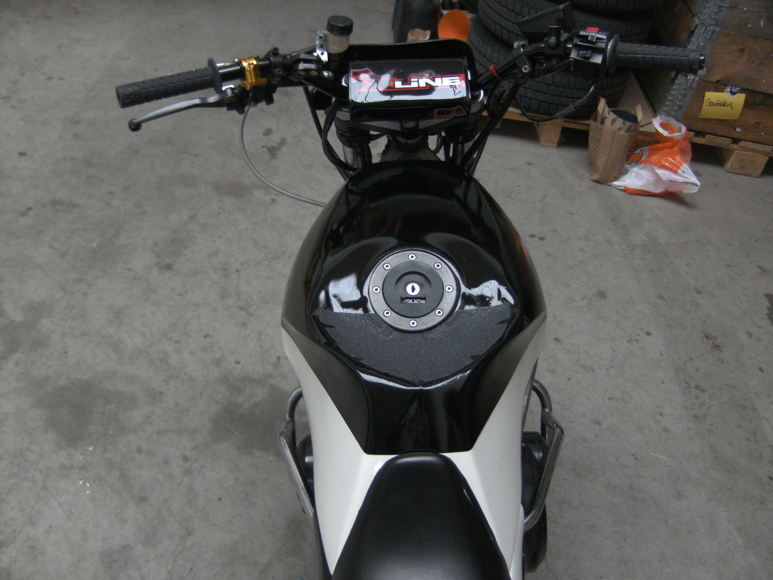 Ist zwar noch net ganz fertig Tank muss noch lackiert werden und der Crashcage fehlt noch andere Griffe "Vom BMX Rad" und GripTape vom Skateboard für eine Antirutsch Oberfläsche auf dem Tank Aber soweit ist se fertig Änderungen: -2te Hinterradbremse -Übersetzung 55/15 -Lampenmaske -Wheelie Bar -Lack Weiß/Schwarz -Kurzer Kupplungshebel "Easy Go" -Strebenlenker -Öl menge wurde um einen halben Liter erhöht |