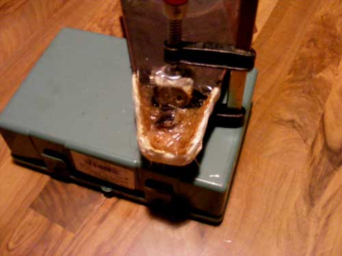 Anschließend wurde der Klotz mit Teppichmesser und Schleifpapier in Form gebracht und fungiert so als Positiv. Kleinere Löcher und Unebenheiten habe ich mit Kerzenwachs ausgeglichen. Wenn man mit der Form zufrieden ist wird das ganze großzügig mit dem Konservierungsspray eingesprüht.