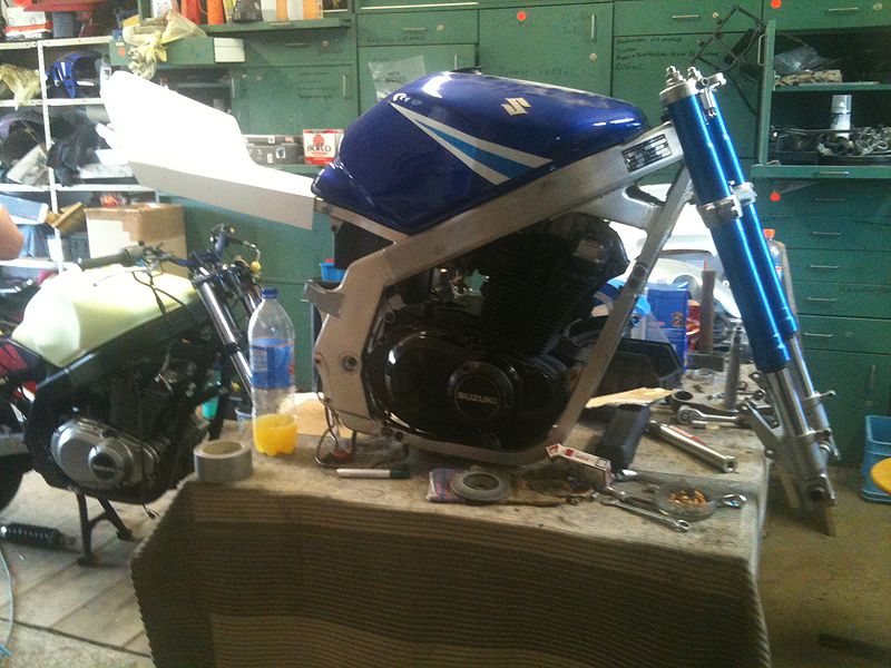 Bei mir wird es nun auch ne GS. Warum Terror? Sie wird laut und soll ein reines Fungerät mit nem schicken Motor werden. Ein paar Eckdaten: * GS Rahmen von 1989 * Gabel Srad von 1996 voll einstellbar mit Wilbers Federn neu gemacht und Holme blau eloxiert. Felge 3,5 x 17 mit 120/60er Reifen * GSX 400 RR mit Überzug von 1989, mit 4,5 x 17er Felge mit nem 160er inkl. Wilbers 631 mit externem Behälter * Rastenanlage aus Eigenbau * Auspuff ab Krümmer im Eigenbau mit ein oder zwei Yoshimura Evo 2 Töpfen * Heck ist aus GFK * Maske von ZXR 1100 und Bugspoiler original Suzuki * Bremsanlage vorne Bandit 1200 (6 Kolbenzangen) hinten GSXR 400RR * Ölkühler * Tank vom F Modell * fürn TÜV und die ersten Fahrproben kommt erst mal ein Serienmotor rein, was danach kommt steht noch nicht fest. ![]() ![]() So mal ein paar Bilder, damit man sich da drunter auch was vorstellen kann. Und bevor wieder die Fragen kommen "wieso ne GS" oder "dafür nimmt man ne erwachsenes Motorrad"... nein, es muss ne GS sein, den Rest kann ja jeder. ![]()