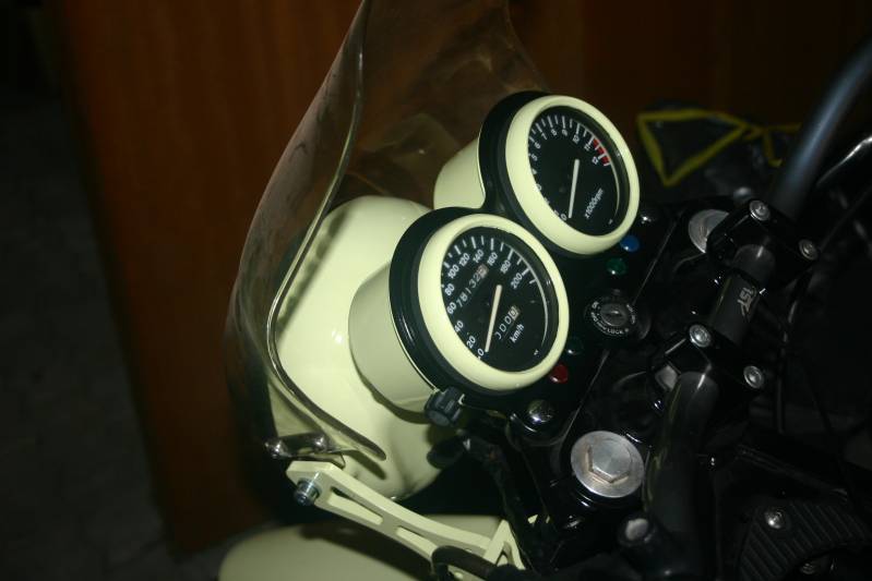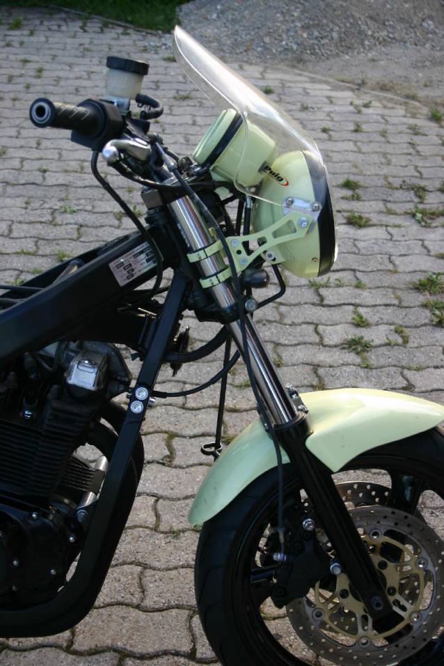 Aktuell überlege ich, ob ich den Originalscheinwerfer mit einem anderen Halter befestige. Ich habe noch einen selbstgebauten aus VA, der ist einen guten Zentimeter länger als der originale, der andere, der noch auf dem Foto zu sehen ist, ist ja noch ein Stückchen länger. Ziel ist es, durch die Montage eines längeren Halters das Windschild (das ja auf Tacho/DZM aufliegt) etwas flacher anstellen zu können. Eventuell baue ich mir noch einen neue Halterung für Tacho und DZM, um diese beide tiefer montieren zu können. Wenn die Lampe weiter vorn ist, könnte man da schon den einen oder anderen Zentimeter runter. Außerdem könnte die neue Halterung von innen die spitze Form des Windschildes etwas mitgehen, die Kontrolllampen könnten dann oben zwischen Tacho und DZM angebracht werden.....na mal sehen...hoffe nur, das es nicht dämlich aussieht, wenn die Lampe so weit nach vorne steht.