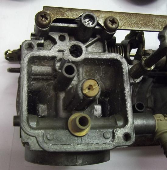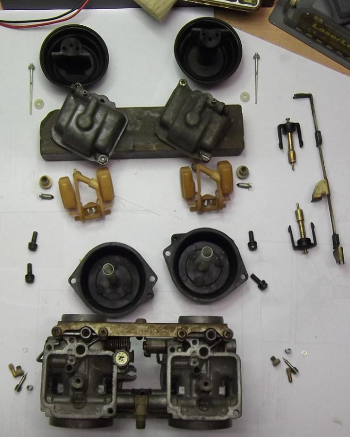 Du schraubst bitte noch die Hauptdüsen raus, das sind die Großen in der Mitte. Das goldfarbene Teil, in dem das Schwimmernadelventil steckt, kannst Du auch einfach rauszeihen, ist nur gesteckt. Die Leerlaufdüsen sind in dem Stutzen gleich neben den Hauptdüsen, die kannst Du mit einem 4mm Schlitzschraubendreher rausschrauben. Dann noch die Leerlauf-Luftschrauben raus (auf dem Foto zwischen den Kreuzschlitzschrauben der Vergaserbefestigung), und danach mal die Gaser umdrehen und vorsichtig auf die Unterlage klopfen, dann sollte da je noch eine kleine Feder und eine kleine Scheibe rausfallen.
