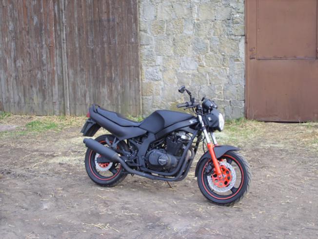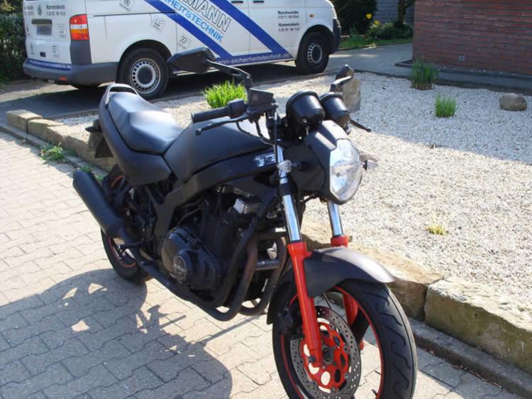 Suzuki GS 500 E, GM 51 B, Baujahr 1993, 40.000km Umbauten / Änderungen: - matt schwarz lackiert mit roten akzenten - stealth spiegel - mini Blinker vorn&hinten - rote Becherbeleuchtung - mt03 scheinwerfer - stahlflexleitung vorne+hinten - progressive Gabelfedern - selbstgebauter Lampenhalter |
