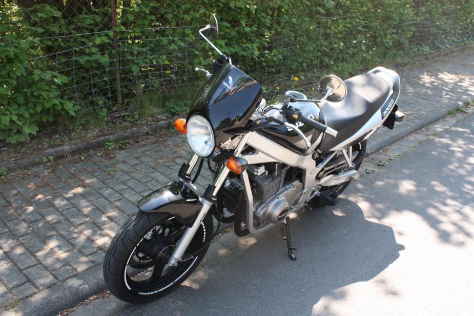 Suzuki GS 500 E, GM 51 B, Baujahr 1994, 26.000km Umbauten / Änderungen: - matt schwarz lackiert mit roten akzenten - lenkerenden spiegel - koso digitaltacho - mt03 scheinwerfer - vtr rücklicht - mbd bugspoiler - stahlflexleitung vorne - superbike lenker - miniblinker schwarz - bsm future auspuff |