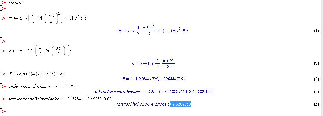 Ich werd dann mich auch auf heute abend gedulden, da ich das Ganze neben der Lernerei gemacht hätte. Ich rechne dann heute abend einfach nochmal gegen, um das Ergebnis zu verifizieren. Mir erscheint tendenziell ein bisschen viel mit den 2,5mm Ich lass das mal eben durch Maple durchlaufen