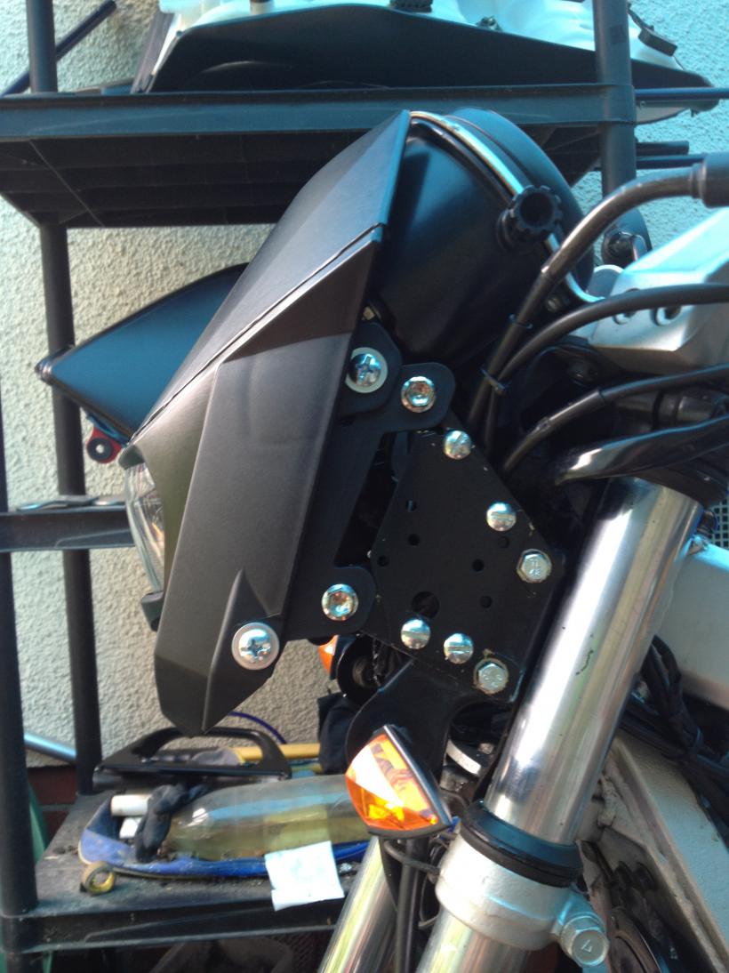 Scheinwerfer ist dran und alles schön fest gemacht. Die Halterung wird allerdngs morgen nochnmal neu gemacht und mit schwarzen Schrauben und Blechen die nicht so durchlöchert sind. Aber so solls ungefähr aussehen: (Das erste Bild zeigt wie das ganze überhaupt hält. Auf dem 2. dann die "Sicherung" damit der Tüv nicht meckert...)