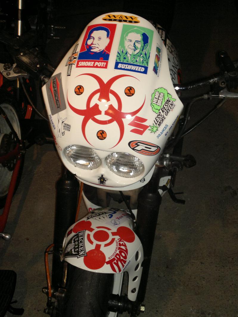 so schön in Sinsheim gewesen, Berndy geroffen und dann noch zu mir in die Garage Chopper guggen. Mal den Sitz provisorisch mit Schaumstoff bezogen, leider reicht mein Stück Leder nicht, hätte farblich sehr gut gepasst. Dafür wieder mal Aufkleber von Maddihn erhalten. Grossen Dank dafür, sind echt klasse. ![]() ![]() ![]() ![]() Hat mich dann so inspiriert, dass ich eine Klebeorgie veranstaltet habe, siehe Bild. Aufgefallen ist Sie auch so schon in Sinsheim und morgen wohl nochmal.