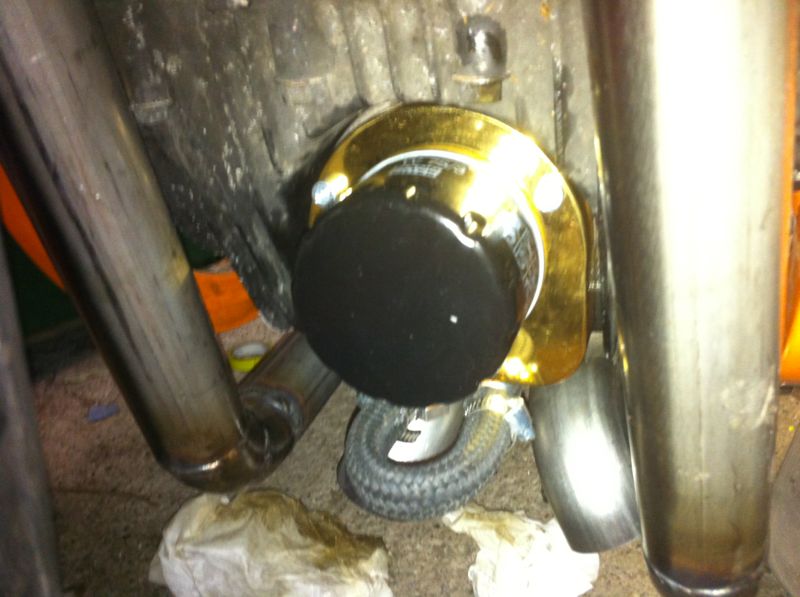 Die ersten Bilder vom güldenen Ölkühlerflansch, ist provisorisch mit Bypass verbaut, und vom montierten Auspuff.