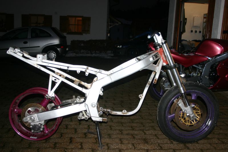 ![]() Nach langer Zeit ist es nun bald geschafft, und meine zweite GS nähert sich der Fertigstellung. Aber fangen wir mal da an, wo es eigentlich los ging. Mitte 2007 war ich mit Goose bei unserem Yamaha Händler weil er ein paar Dichtungen für seine Dicke suchte, als wir da so im Laden stehen und auf die Teile warten sehe ich eine Cup R6 dort stehen, die erste mit USD Gabel, und nem richtig geilen Heck und nem richtig breiten Reifen…. Als ich Sie mir so ansah, kam der Verkäufer zu uns, und wollte Sie meinem Mann verkaufen…. Als er dann spitz kriegte das ich sie haben wollte hat er mir davon abgeraten… es wäre eine Maschine die man beherrschen müsse….. egal, ich war etwas sauer, aber gekauft hätte ich Sie mir trotzdem nicht. Auf dem Rückweg sagte ich dann zu meinem Mann dass ich auch nen 180er und ne USD Gabel in meiner GS haben wollte. Und das Heck wäre auch nicht schlecht von der R6. Nun ja, mein Lilalaunebär war ja fertig, und den wollten wir nicht mehr zerreißen, also ging es dann ans Teile suchen. Die Wahl viel dann auf eine Schwinge der RF 900 weil sie so schön zum GS Rahmen passte, und auf ne RGV Gabel weil die ja ganz gut für ne GS geeignet ist. Eigentlich hatte ich mir noch ne Five Stars Verkleidung zur Seite gelegt, aber irgendwie passte die gar nicht mehr zu dem R6 Heck. Also hab ich mich umgeschaut und mich für die Verkleidung des F Modelles entschieden. Goose war dann so lieb und hat meinen alten Rahmen dann so umgebaut, dass die F Verkleidung auch an den alten Rahmen passte. Bei der Gelegenheit haben wir dann auch auf den neuen Tank umgebaut. Das Rolling Chasis stand dann relativ schnell, allerdings mussten wir feststellen, dass mein Wunschheck nicht so ganz zu dem Serienheckrahmen der GS passte.