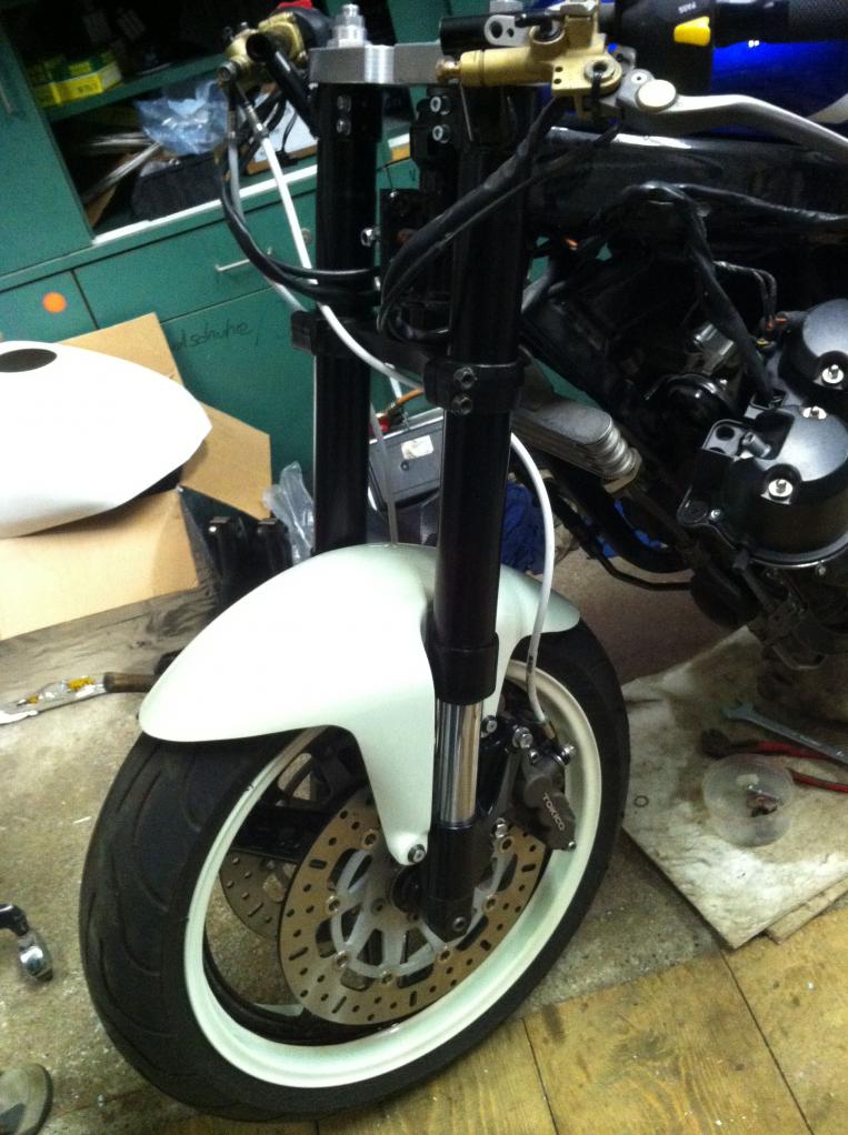 Die neue Gabel wanderte endlich an Ihren Platz, mit allem was sonst noch dazu gehört, neue Bremsscheiben, 6 Kolbenzangen, Stahlfelxleitungen in weiß mit schwarzen Fittingen usw . Ich bin echt begeistert, auch wenn die Farbe auf den Bildern nicht mal annähernd an die originale Farbe ran kommt. Der Ölkühler wurde montiert und die Leitungen sind nun auch fertig. Viele Dinge die wir machen wollten und wieder verworfen haben, habe ich jetzt einfach mal weg gelassen, weil das sonst die ganze Geschichte sprengen würde.