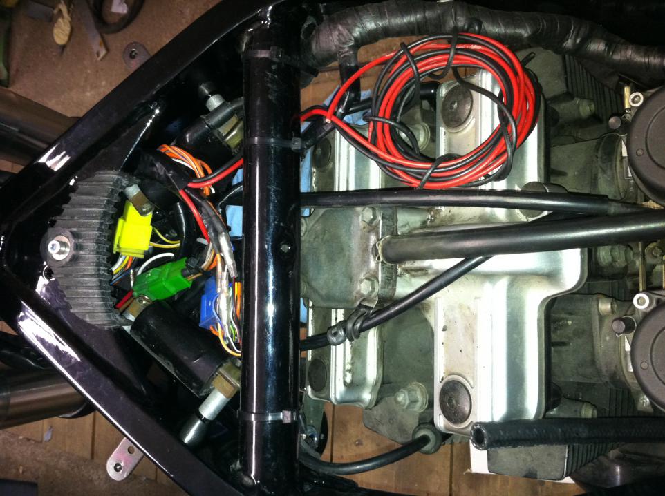 Jetzt kam dann der Teil wo ich nicht mehr mich nicht auskenne, die Elektrik, eine Woche haben meine Jungs da unten in der Halle Kabel und Strippen gezogen bis alles so passte wie es sein sollte. Das war dann so die Halbzeit als Sie das erste mal ansprang und von alleine lief. Leider wurde Sie auch sofort inkontinent, da wir vergessen hatten den Drehzahlmesserausgang dicht zu machen. Die neuen Instrumente haben einen elektronischen Anschluss, und da ist das irgendwie in Vergessenheit geraten.