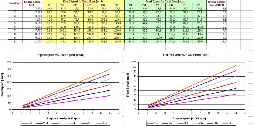 Anm; Die Excel-Spreadsheets stammen von Roberto Veneditto und können hier bezogen werden: http://cgi.stanford.edu/~sanjayd/gs5...ringCalculator . Mit diesem Excel-Programm kann man das Getriebe und alle Übersetzungsvarianten prima berechnen. Alle Werte wie Reifengroesse, Kettenradgroesse und Ritzel koennen aufgenommen werden. Dann sieht man was moeglich ist. Angehängt sind die Berechnungen für meinen Test in der letzten Woche - mit folgenden Werten (s.o.): - Ritzel auf 18, Kettenrad auf 36 Reifen auf 130/90.