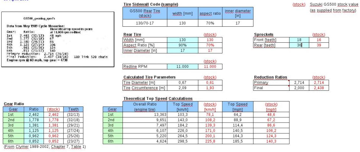 Anm; Die Excel-Spreadsheets stammen von Roberto Veneditto und können hier bezogen werden: http://cgi.stanford.edu/~sanjayd/gs5...ringCalculator . Mit diesem Excel-Programm kann man das Getriebe und alle Übersetzungsvarianten prima berechnen. Alle Werte wie Reifengroesse, Kettenradgroesse und Ritzel koennen aufgenommen werden. Dann sieht man was moeglich ist. Angehängt sind die Berechnungen für meinen Test in der letzten Woche - mit folgenden Werten (s.o.): - Ritzel auf 18, Kettenrad auf 36 Reifen auf 130/90.