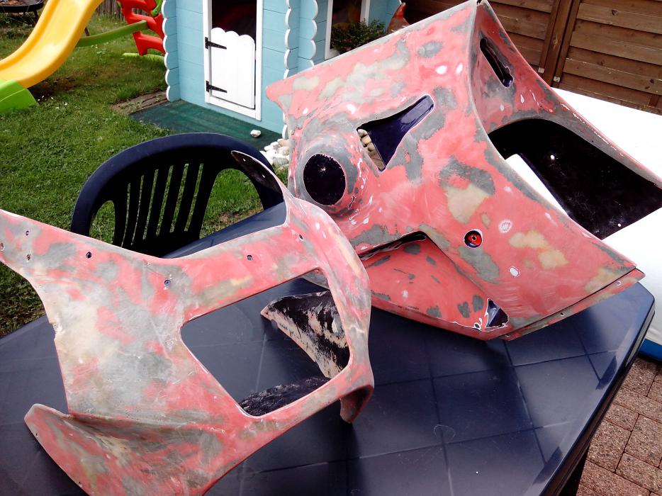Das Polyestherharz haftet wie die Pest selbst auf den Stellen mit Farbe. Lässt sich nur durch Schleifen entfernen. Die reparierten stellen halten bis jetzt sehr gut. Bei der Maske habe ich mir von Innen das vollständige Abschleifen der Farbe erspart, da es nur als Basis für das Laminieren von vorne dient. Möchte so wenig Spachtel wie möglich verwenden und werde deshalb von vorne mit Übermaß auflaminieren und dann auf das Maß runterschleifen. An den zu reparierenden Stellen mit großer Belastung habe ich die Farbe vollständig entfernt, soweit es eben ging und beidseitig stark überlapend laminiert. Das Endergebnis macht einen stabilen Eindruck. Morgen/heute Morgen geht es weiter. Von vorne die Maske laminieren und in der Trocknungszeit widme ich mich dann endlich dem Frontfender...wenn nur der scheiß Gabel-Stabi nicht wäre. Kriege den nicht ab. Der Inbus ist zu weich und die Schrauben zu fest drin