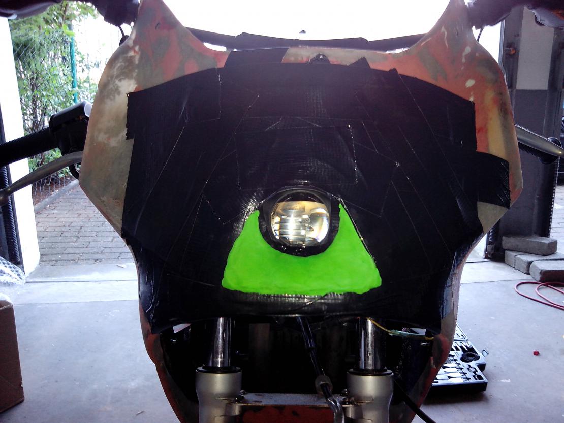 So, heute gehts weiter. Die Verkleidung nochmal angebaut um die Scheinwerferposition festzulegen. Dabei habe ich festgestellt, dass die VVK auf der rechten Seite am Motor anliegt. Der Vorbesitzer hatte scheinbar das selbe Problem, weil es an der Stelle eine Ausbröckelung gab. Stellt sich jetzt die Frage, ob die VK im unteren Bereich verzogen ist und wie man das korrigiert. Es gibt ja unten keine Befestigung.