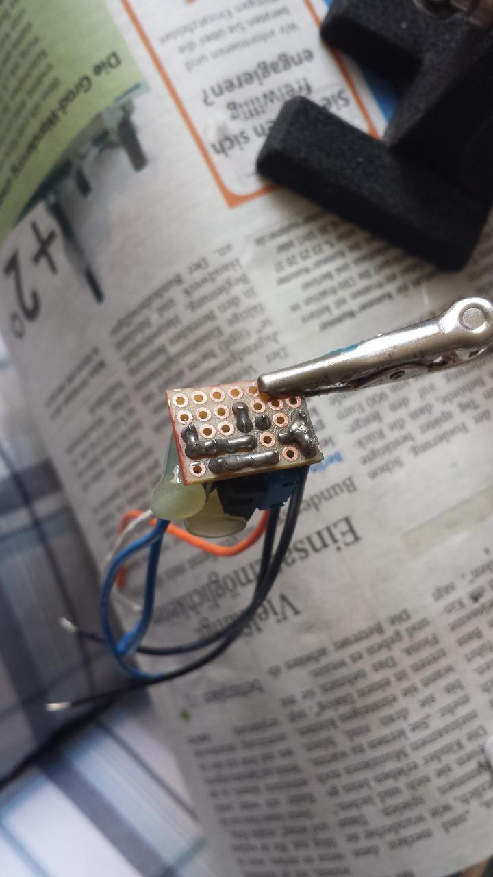 Selbstklebende Aluminiumfolie gibt's beispielsweise in Baumärkten zu kaufen (bei Hornbach weiß ichs, hatte ich da schon in der Hand; andere sollten sowas aber auch haben). Sieht dann SO aus. EDIT: Ich hab meiner Selbstbau-Tachobeleuchtung (siehe weiter oben) mal ein Update spendiert, da die Beleuchtung vom DZM nen Wackler hatte. Ich hatte in der ersten Version den Spannungsregler zum Einen doppelt verbaut, einmal für den Tacho und einmal für den DZM, und zum Anderen die Platine in den Bechern untergebracht. Da ich jetzt aber zur Wackelkontaktbeseitigung den Becher sowieso nochmal aufmachen musste, hab ich gleich beide geöffnet und die Schaltung dahingehend optimiert, dass ich nur noch einen Spannungsregler für BEIDE Anzeigen habe, den ich dann zudem auch nicht mehr im Becher untergebracht habe, sondern in dem kleinen mittig gelegenen Zwischenraum zwischen den beiden Bechern in der schwarzen Halterung, verdeckt von der silbernen Blende. Dafür habe ich allerdings die beiden Stromleitungen für den Tacho und DZM zu einer Leitung kombiniert und auf die Platine geführt (also parallel geschaltet). Funktioniert aber super und genau wie erwartet. Dadurch, dass die Platine aber jetzt nicht mehr geschützt im Becher untergebracht ist, hab ich die einfach komplett mit Heißkleber vergossen; falls es doch wieder Probleme machen sollte, kann ichs einfach mitm Heißluftfön wieder schmelzen (oder einfach neu aufbauen; kostet ja nicht die Welt, besteht ja eh nur aus dem LM317, einem 220Ohm Widerstand und dem Poti zum Regeln der Helligkeit). Hab auch einige Bilder gemacht um das mal zu verdeutlichen: Platine von unten (wirklich einfach aufgebaut): Hier sieht man den Stecker, der dann einfach in die originale Lampenfassung gesteckt wird, ist quasi der Sockel der originalen Birne an den ich den LED-Steifen gelötet hab: Das ist die fertige Kabelage, wie unschwer zu erkennen besteht das aus der vergossenen Platine, den beiden Fassungen in die dann einfach wieder der Sockel reingesteckt wird und dem Stromkabel, alles fein säuberlich mehrfach verschrumpft: Arbeitsaufwand für alles war nicht groß, hab mir aber auch Zeit gelassen... Das schwierigste war eben nach wie vor das Auf- und Zubördeln, aber das dürfte jetzt für eine ganze Zeit passé sein, es sei denn die LEDs machen die Grätsche, aber dadurch, dass die bei ca 11V laufen und die Spannungsspitzen durch die Schaltung abgefangen werden, sollte es da für die nächsten Jahre keine Probleme mehr geben. Bei Bedarf kann ich mich auch nochmal ransetzen und nen Schaltplan zeichnen, ein bisschen Übung in EAGLE könnte mir auch nicht schaden Da könnte man ja langsam aus dem Thread hier nen Sticky machen