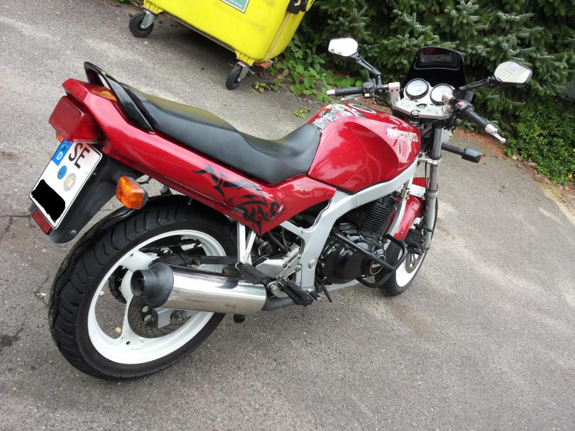 Das geht schließlich nicht mit einem schmutzigen Möp mit "schwarzen" Felgen ;D Aaalso, gekauft habe ich sie im April 2011 mit 22.000 km und paar Zerquetschten. Gedrosselt auf 34 PS. Ich bin die 5. Hand. Gemacht wurden seinerzeit die Bremsflüssigkeiten (welche äußerst dunkel waren), Öl, Zündkerzen, Öl- sowie Luftfilter (beide waren seehr schwarz und bah). Die Maschine muss sich auf alle Fälle schonmal ordentlich gelegt haben, denn auf der rechten Seite (Bremshebel, Blinker, Sturzbügel, Lenkerende) sind richtig schön abgefetzt. Ein paar Monate später habe ich mir neue Reifen (BT45) gegönnt. Dieses Jahr im Frühjahr/-sommer kam ein neuer Kettensatz drauf. Mittlerweile habe ich noch 60km zur 29.000er Grenze. Ich weiß, bin nicht sonderlich viel gefahren. Aber immerhin die letzten Monate mehr als im ganzen letzten Jahr. Die wunderhübschen "GS500" Aufkleber an den Flanken sind ab. Dafür kam ein von mir gezeichnetes Tribal auf die Flanken (mein Schatz hat lackiert). Nicht perfekt, da die Ränder noch sind, aber mir reichts und es passt. Außerdem galt es, einige Schrammen zu verdecken (auch eine große ist von mir). Jetzt am WE haben wir bei mir vorn und hinten schwarze Stahlflex verlegt. Den rechten Bremshebel habe ich erneuert, weiße SMD-LEDs für die Tachobeleuchtung verbaut, die Felgenbänder abgemacht und mal ordentlich geputzt. Jetzt habe ich wieder weiße Felgen. Die Suzuki Aufkleber am Tank wollte ich dran lassen. So schlimm und hässlich finde ich nicht. Zumal das ne Prozedur wäre schleifen und polieren (hat Felix bei seiner getan). Da hab ich keine Lust drauf xD Noch was? Hmm.. ach ja! Der Tipp mit dem Backofenschaum für die Felgen war und ist absolut genial!! Ging ohne Probleme ab. Und dazu sei gesagt, ich habe das Möp bisher noch nie wirklich geputzt.. Ein bisschen vielleicht. Dementsprechend sahen die Felgen aus. *puuuh* Zum Geburtstag habe ich von meinem Schatz die von mir sehnlich erwünschten Skelett-Spiegel bekommen. ^//^ Irgendwann würde ich auch gerne die dazugehörigen Blinker installieren. Da die doch einiges kosten, ist das erstmal nach ganz weit hinten verschoben. Was dringend gemacht werden müsste, sind vorn und hinten neue Bremsscheiben und -klötze. Ich muss meine nicht unbedingt entdrosseln, wäre aber doch ganz nett. Vielleicht klappt das ja mal, dass wir ein paar erfahrene Schrauber bei uns einladen, damit die Bremsen gemacht werden können (und vllt auch mal das Entdrosseln). O Na denn, im Anhang sind nochmal ein paar Bilder von heute. Bitte nicht von der gelben Tonne irritieren lassen. ;p |