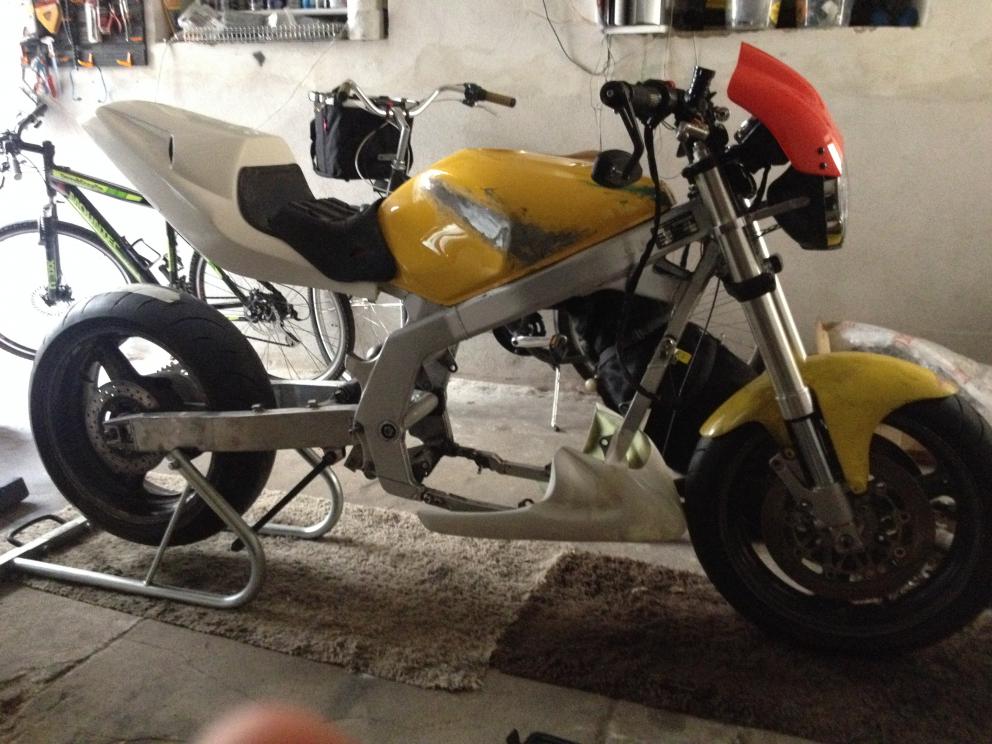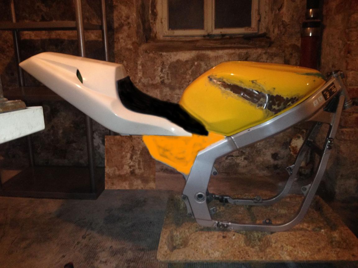 Edit: Der Rahmen hat mir jetzt inkl. Versand 150€ gekostet. Eingetragen sind RGV-Gabel, Bugspoiler, Heckumbau (Mito), Stahlflexleitungen, Soziusrasten ausgetragen, Fußrasten nach aussen versetzt, Spiegler SBL, B6 Schwingenumbau - was die Eintragungen alleine schon kosten! Vom Heck umschweissen ganz zu schweigen. Bin der Meinung es war ein guter Deal! |