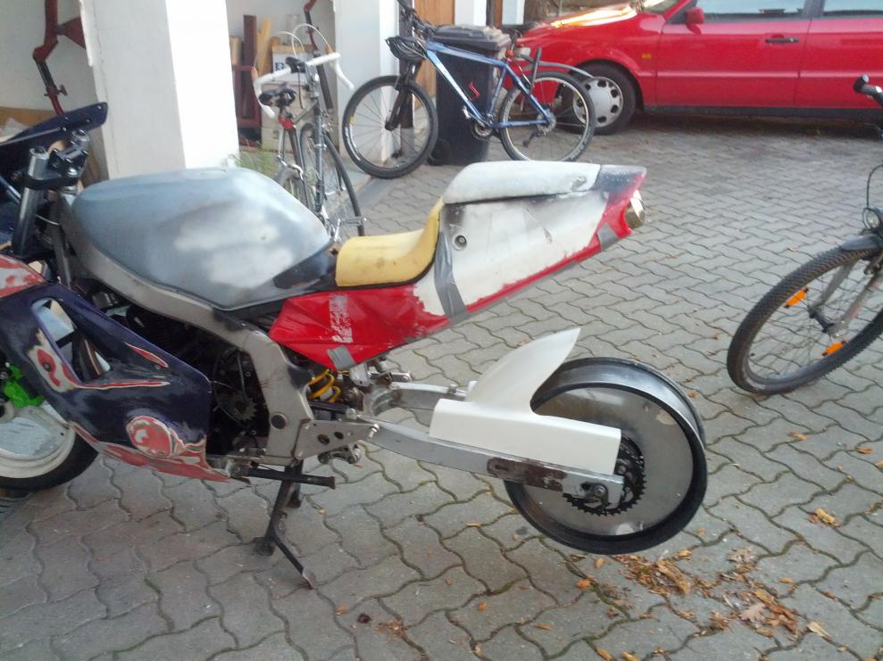 Spaß beiseite, ich habe ein Paket bekommen. Nur muss ich den Kettenschutz verlängern und den Böppel für die Bremsankerstrebe weg- und das Loch zumachen. Die Einzelanfertigung hätte zu viel gekostet.
