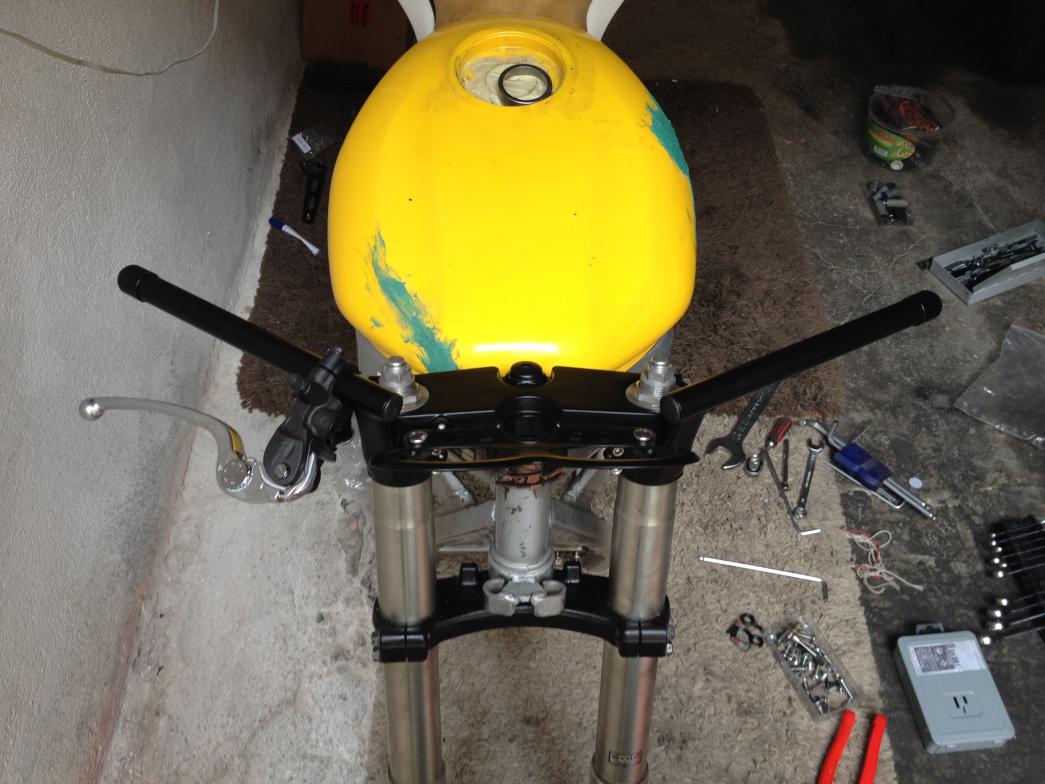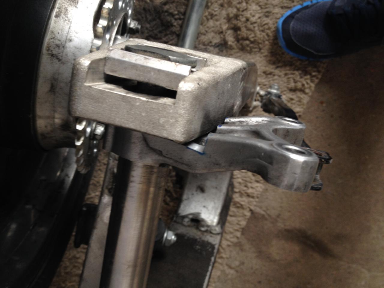 Auch ohne am Cockpit was zu ändern sollten da ein paar Zentimeter drin sein. Oha, is das mit dem wild zersägten Bremssattelhalter mit dem Graukittel abgesprochen? Sieht abenteuerlich aus, bee dem Materialschwund... Warum hast du nicht einen neuen Halter aus Stahl gebaut? Damit bekommt man doch bei stark reduzierter Baugröße mindestens die selbe Festigkeit des Alugussteils hin.