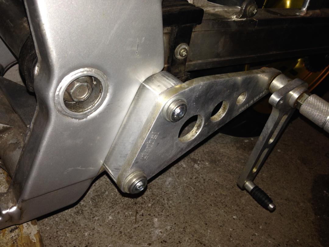 Heute mal wieder ein paar Stunden geschraubt. Die Fußraste ist nun fast komplett. Stahlflex und Bremslichtschalter sind montiert. Der Auspuffwinkel und der Flüssigkeitsbehälter passen jetzt auch. Fehlt nur noch die Distanz um die Fußraste nach aussen zu versetzen.