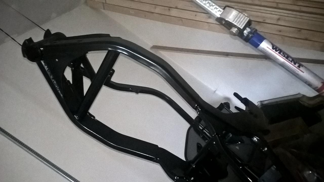 Erstmal die Kiste gefleddert und den Motor zur weiteren Behandlung entnommen. Da sollen die Ventile eingestellt werden und die Seitendeckel poliert werden...mal den Tank aufgelegt,- ich glaube Hochglanzschwarzer Rahmen wird zum Tank passen. Nur mim Heck bin ich immernoch nicht schlüssig. Die Befragung des TÜVs wurde outgesourced,- vielleicht erreicht mein Kumpel was bei den Männern in Blau bezüglich der Rahmenheckänderung...