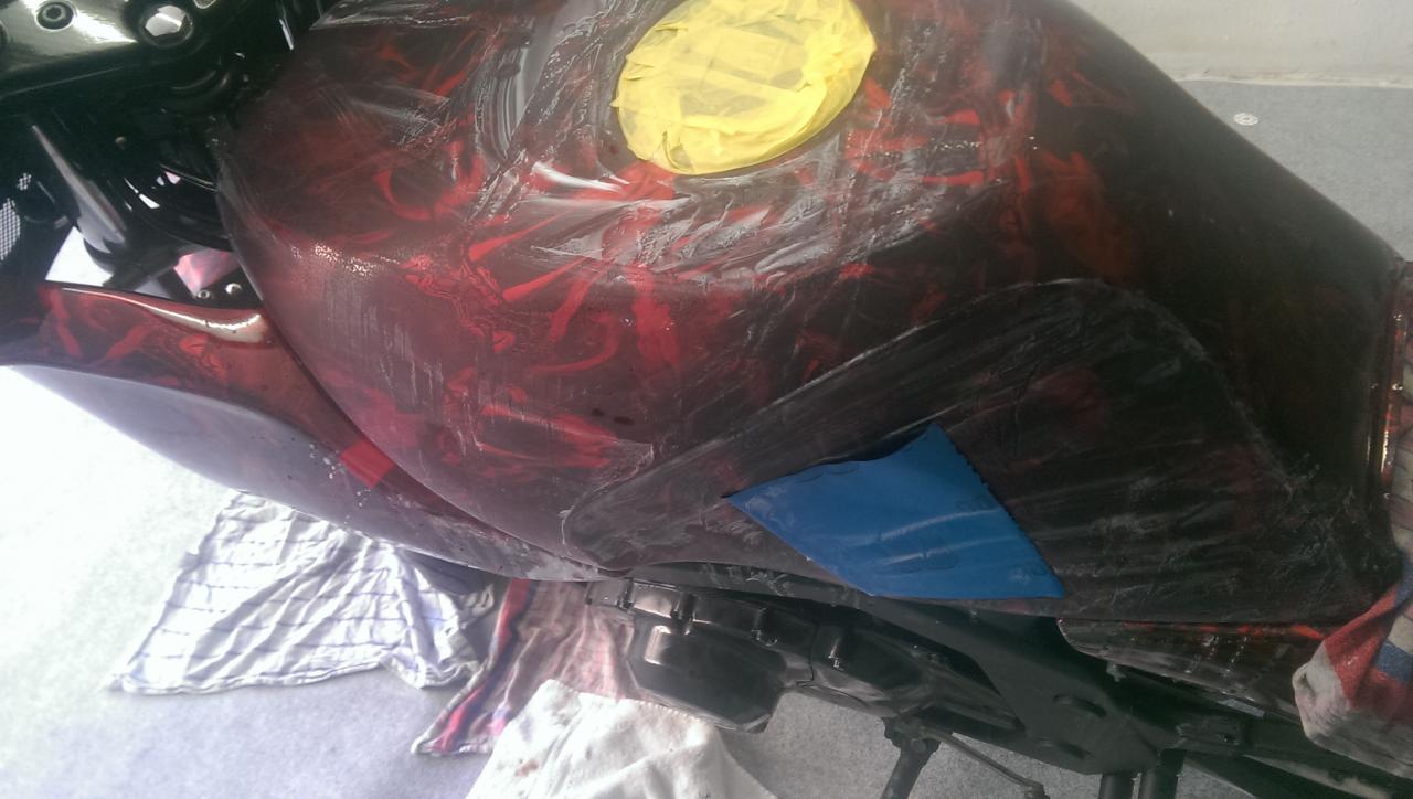 also erstmal alles kompl. zerlegt und Rahmen, Tank sowie Schwinge zum Sandstrahlen gebracht. Danach noch den Tank gespachtelt, Metallteile grundiert und manches in schwarz matt lackiert: