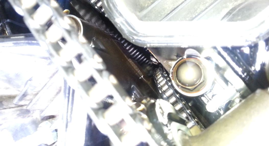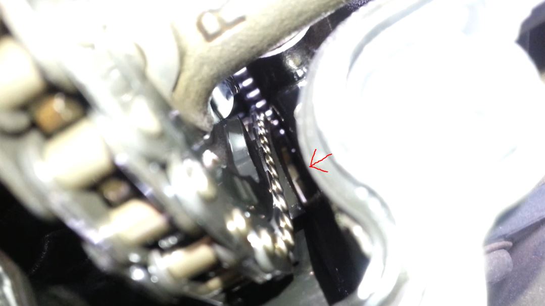 Der rote Pfeil zeigt auf den Steuerkettenspanner