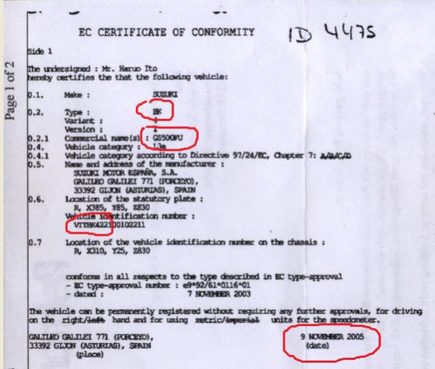 Hersteller: Suzuki Spanien EG Zertifikat vom 9. November 2005 (siehe Bild) Typenbezeichnung: BK Handelsbezeichnung:GS500FU Identifikationsnummer: VTTBK4...................... Erstzulassung: 03/2006 Nr. 0.1 in der Zulassungsbescheinigung: SUZUKI BK Nr. D.3 in der Zulassungsbescheinigung: GS500FU ABE Nr. 91079 für Wirth-Gabelfedern Art.Nr. 3070 vom 27.02.2008 (siehe Bild) Verwendungsbereich: Suzuki BK GS 500 F ab 2004 |