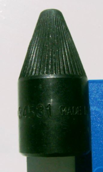 Die Größe entspricht einer 3/8 Zoll Schraubnuss und hat einen Durchmesser von 20 mm und eine Höhe von 41 mm. Ab der Mitte verläuft das Material konisch bis zum Ende, das abgeflacht ist. Das abgeflachte Ende hat einen Durchmesser von 6 mm. Der konische Teil ist geriffelt ähnlich wie bei einem Bohrlochentgrater. Man kann diese Nuss an eine 10 mm Vierkantverlängerung stecken.
