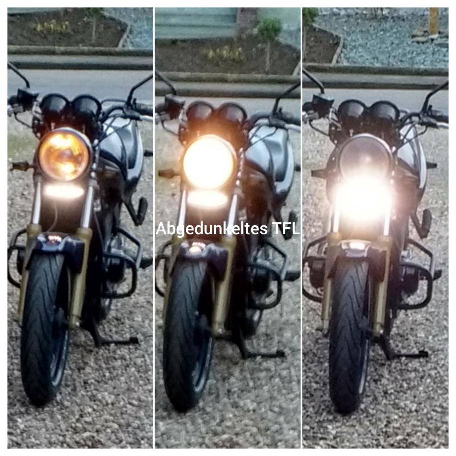 Besichtigung des TFL´s. Kollege war erstaunt, wie viel das bringt. Thema: muss das Rücklicht dann auch gehen? Ja. Ihr habt recht. Sinn macht das nur mit Rücklicht. Habs so angeschlossen, das beim einschalten des Fahrlichs das Rücklicht mit an geht. Fühle mich damit auch wohler.