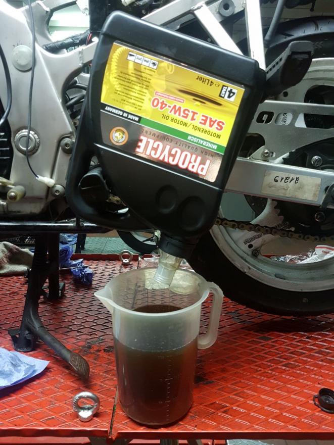 Nebenbei beim Schrauben festgestellt, das man die Fußrasten zum Austropfen eines Ölkanisters "missbrauchen" kann und den Kabelbaum hinter der CDI-Box aufgeräumt.