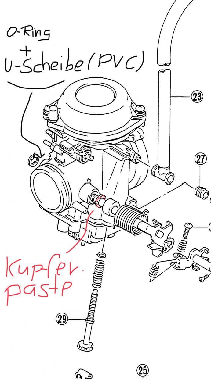 Habe einfach einen O-Ring eingebaut und sämtliche Filzdichtungen mit Kupferpaste eingeschmiert. (Siehe Anhang.) @gsmattis da muss ich leider sagen, dass ich ratlos bin. Vergaser ist komplett dicht (laut Bremsenreiniger-Prinzip). Wenn dann würde mir als einziges die Werkstatt helfen ... Habe bis jetzt alles möglich getan was ich machen konnte. Das aller letzte was ich noch vielleicht in Betracht ziehen kann, ist die Standgasgemischschraube, da sie eine der wenigen Teile ist, die ich verändert habe. |