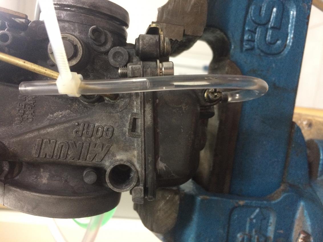 Teste nun endlich den Schwimmerstand bei geöffneten Ablassschrauben mit aufgestecktem Schlauch und auf PRI gestelltem Benzinhahn.