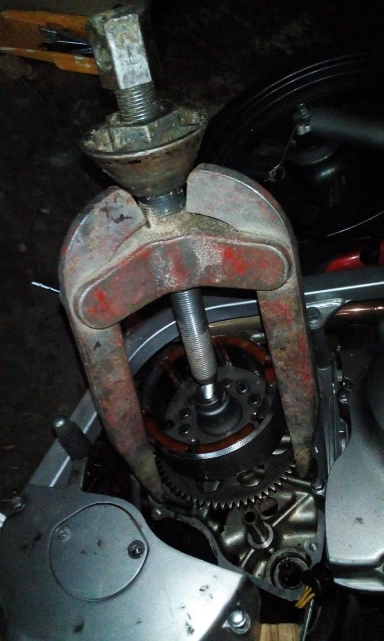 Keinesfalls am Zahnrad ansetzen - das wird Schaden nehmen - da kommt ordendlich Zug drauf! Bei der GS ist die Schwungscheibe ja nur durch die Presskraft am Konus fixiert (keine Nutfeder), und die ist enorn. Wenn du mit den Klauen nicht einen guten Halt direkt am Schwungradmagneten bekommst (-> abrutschen), vergiss diese Methode.