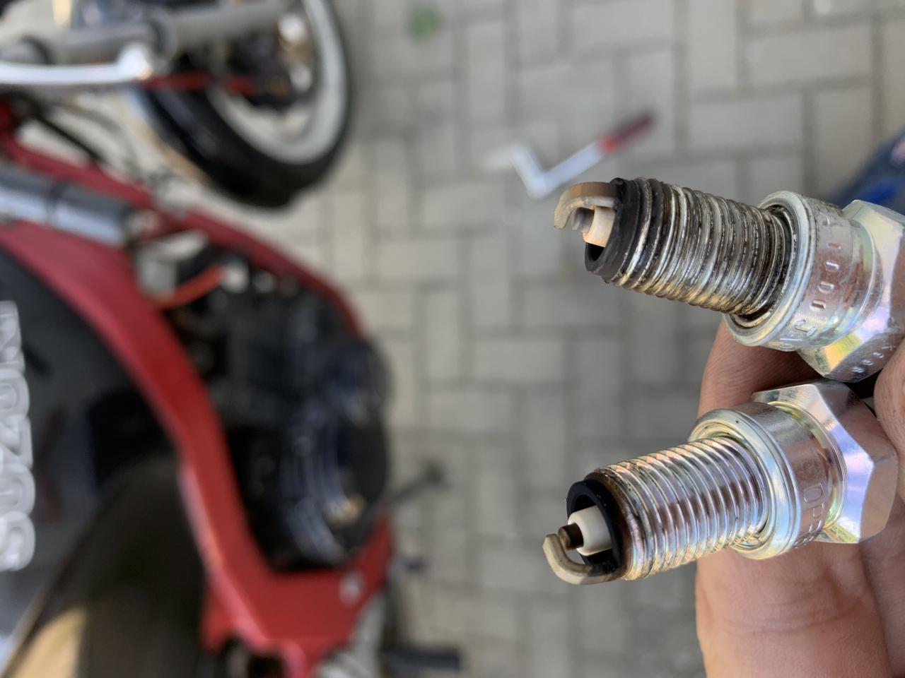 Wie sich zeigte, war es die linke Zündkerze. Als die Maschine mal richtig schlecht fuhr, zog ich einfach mal Testweise die Zündstecker ab. Da zeigt sich, das sich links keine Änderung ergab. Ich hatte die Zündkerze garnicht im Visier, da die keine 20km alt war. Scheinbar könnte die Kerze im unterem Drehzahlbereich keinen ordentlichen Funken bilden. Naja, alte rein und nun läuft sie wesentlich besser. Noch immer kein Traum, aber damit lässt sich leben. |