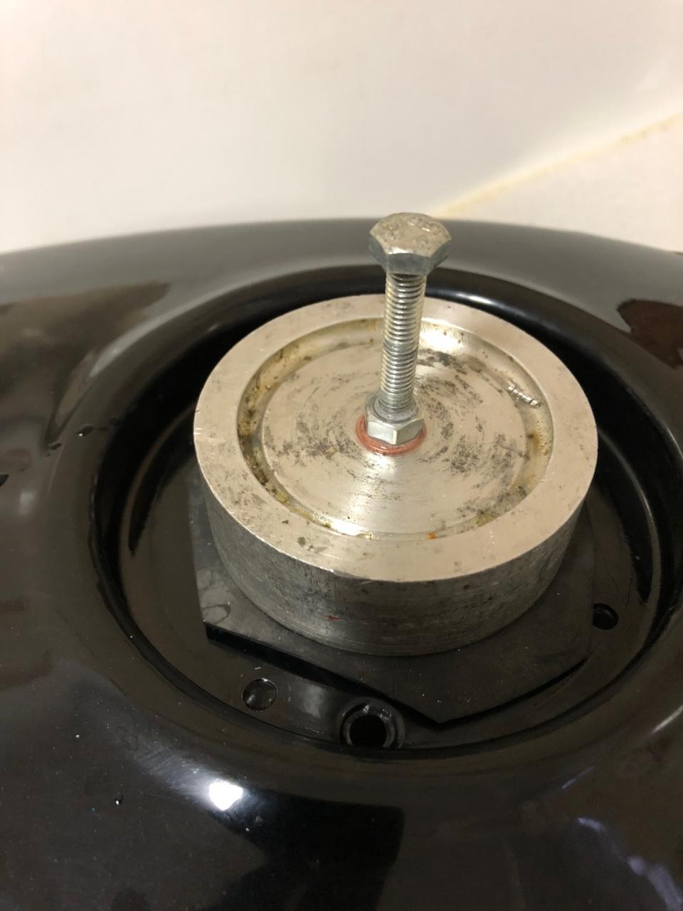 Für den Benzinhahn-Anschluss habe ich mir eine Verschlussplatte gemacht, für den Tankdeckel einen provisorischen, dichten Verschluss angefertigt aus Resteteilen, als Dichtung habe ich ein Stück aus einem alten Fahrradschlauch verwendet, siehe Bild. Die Schraube zieht einen quergelegten Metallsteg innen nach oben, der stemmt sich dann gegen den oberen Kragen am Einfüllstützen.
