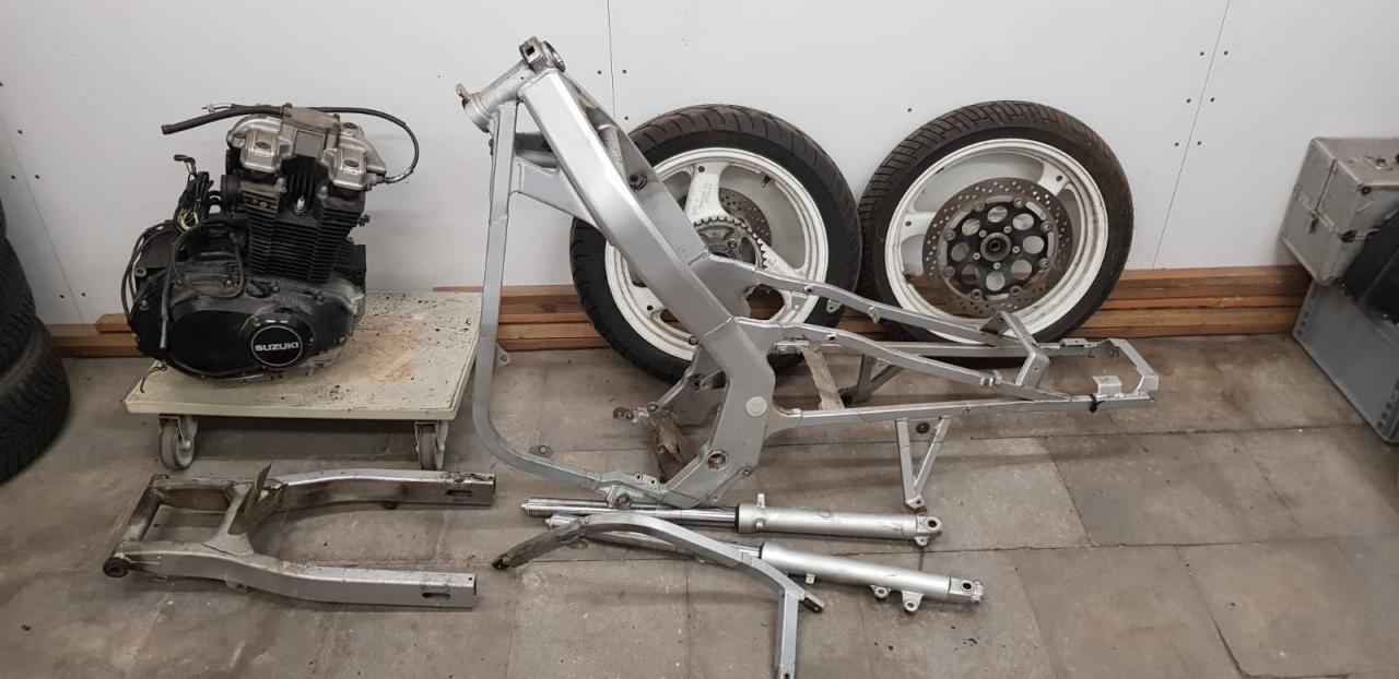 Wie im Vorstellungsthread schon erwähnt, haben wir am 11.04.2021 eine GS500 EU abgeholt und sie kurzzeitig in den Winterschlaf gelegt, bis die beiden Autos fertig sind und Thomas mit seiner Supermoto halbwegs durch ist.. immerhin soll die dieses Jahr noch auf die Straße.. 🤭