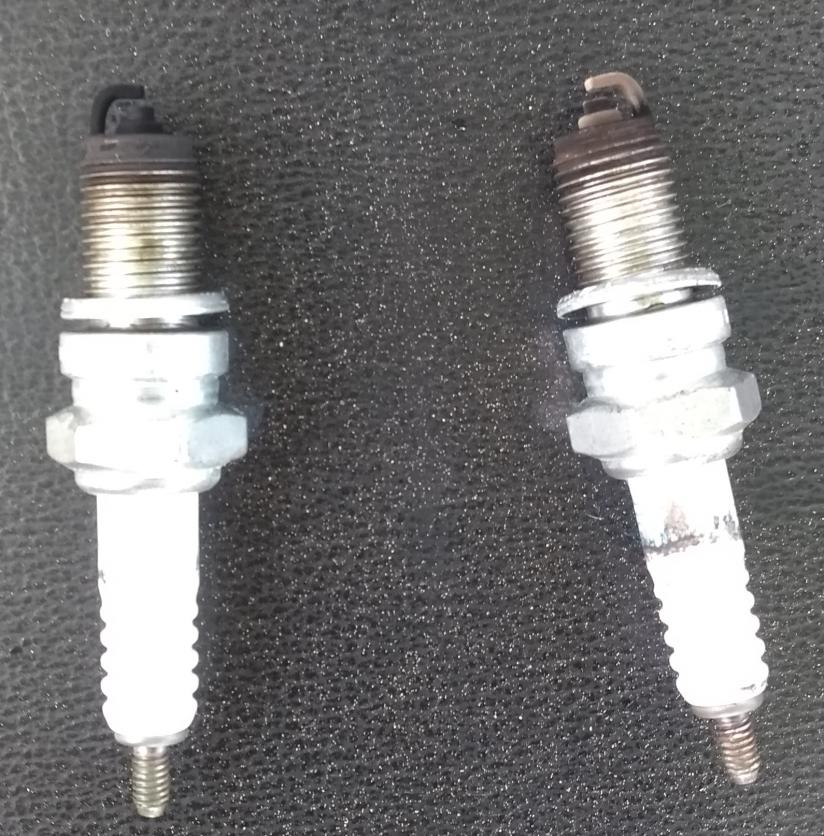 Heute hatte ich dann die alten Zündkerzen raus und neue rein. Die eine pechschwarz, die andere braun. Mit den neuen Kerzen konnte ich den Motor wieder starten, nahm trotzdem kein Gas an. Also wieder Kerzen raus, die eine war wieder schwarz, die andere wie neu. Bilder unten.