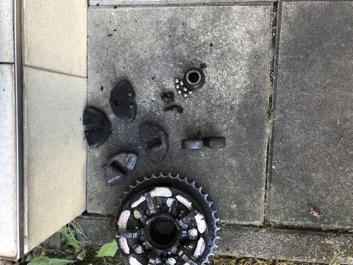 Heute bei der GS das Hinterrad ausgebaut damit es neu besohlt werden kann, dabei hat sich das Kugellager beim Kettenrad in seine Bestandteile aufgelöst. Beziehungsweise die Ummantelung der Kugeln (siehe Bilder).