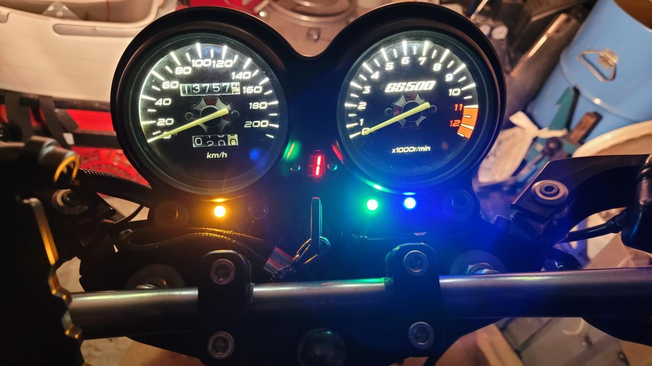 Tacho und Drehzahlmesser ein neues Zifferblatt spendiert... mit dem Umbrella Logo in der Mitte. Beides provisorisch eingebaut und bei einer Probefahrt die Zeigerstellungen überprüft (Geschwindigkeit muss noch nachjustiert werden). Ausserdem den Gangsensor einer GSX400 verbaut, die Ganganzeige kommt hoffentlich morgen. Kette nachgespannt und jetzt wird noch ein wenig an den Anzeigeinstrumenten gebastelt, damit die dann auch fertig sind, wenn alles wieder zusammen gebaut wird. Die Handschützer wurden auch noch ein wenig mit dem Heissluftfön bearbeitet, damit die spannungsfrei sitzen. Die wurden zwischen Lenkerende und einem Zwischenstück an den Schraubenlöchern der Stummellenker Befestigung angepasst.