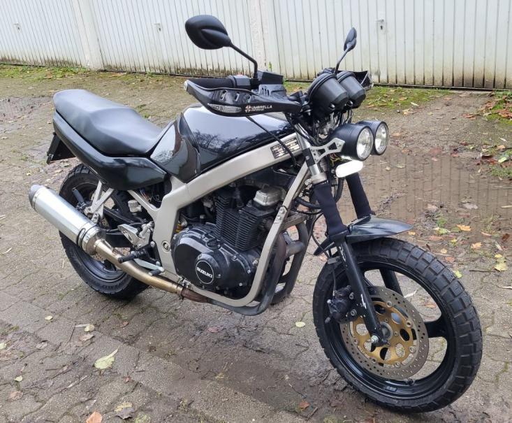 Gabel ist mit Wilbers Federn versehen, die Pirelli Scorpion STR sind montiert und mit vorne 110/70/17 und hinten 150/70/17 an ihrem Platz. Ich hatte das Gefühl, dass ich ein komplett anderes Moped unter dem Hintern hatte. Der Umbau ist fast fertig und sie gefällt mir jetzt schon sehr gut... und sie fährt sich traumhaft! Bis ca. 50 km/h wendig und agil wie ein Mountainbike und man muss die Kurven echt konzentriert fahren. Darüber hinaus stabilisiert sie sich und wird wieder lammfromm.