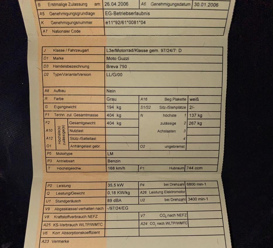 So, jetzt habe ich den richtigen Zulassungsschein für die Guzz Breva 750: Zugelassen als Leichtmotorrad mit 35,5KW: