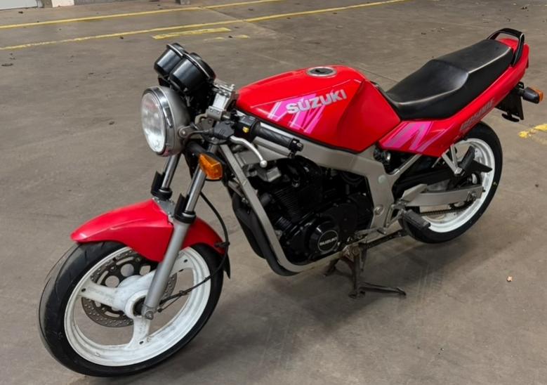 Ich hoffe, dass es Euch als gute Orientierung für die Wiederinbetriebnahme und für kleinere Umbauten (siehe weiter unten) dient. Hintergrund: Meine GS Baujahr 1992 in der Farbkombi Rot mit pinken Original Suzuki Aufklebern war das erste gemeinsame Motorrad meiner Eltern. Nachdem die Maschine von 2004 bis 2014 keine 1000km mehr benutzt wurde, wurde die GS von meinen Eltern an Freunde in die Eifel verschenkt. Leider wurde sie dort nur in 2014 kurz gestartet und einmal um den Block gefahren. Danach wurde sie abgemeldet und stand von 2014 bis 2024 ohne Abdeckplane unter einem undichten Carport. Nach dem frühen Tod meines Vaters im Sommer 2024, kontaktierten mich die Besitzer der GS und boten an, dass ich die Maschine gerne abholen könnte, da mein Vater zu Lebzeiten immer wieder von einer Wiederinbetriebnahme der schönen Maschine schwärmte. Es ging los: Im Herbst 2024 holte ich die Maschine in der Eifel per Hänger ab und brachte sie zu einem Freund der alles an Hallen und Werkzeug parat hat (Kreis Euskirchen). Rahmen zeigt überall leichte Roststellen, aber Substanz ist in Ordnung. Wie durch ein Wunder, sieht der Auspuff top und ohne Rost aus, obwohl der am exponiertesten dem Wetter ausgeliefert sein musste. Überall war Moos und Mock an der Maschine = Hochgradig verwitterter erster Eindruck, platte Reifen und verranzter Zustand. Leider waren auch die Schlüssel nicht mehr auffindbar, aber nach ewig langer Suche zumindest die Papiere. Glück im Unglück: Das Lenkradschloss wurde nicht genutzt, sodass wir die GS schieben konnten. Tachostand: 21.000 km. Schritt 1 (Reinigen) Motorrad wurde vom Hänger geladen und mit einem Hochdruckreiniger vorsichtig vom Mock der letzten 10 Jahre befreit. Mir war klar, dass alle Flüssigkeiten inklusive Öl noch von 2004 sein müssten. Der Sprit war auf jeden Fall von vor 2014 und die Reifen von 2001 natürlich spröde von der Witterung. Schritt 2 (Tank und Vergaser) Tank und Vergaser sichten. Die Suppe im Tank hat, entgegen aller Erwartungen, den Tank halbwegs konserviert . Außer minimaler Patina im Tank war alles in Ordnung. Einmal mit 5 Liter frischem Super Plus durchgespült und alles gut ohne Partikel im Sprit. Vergaser ausgebaut und siehe da: Keine Verunreinigungen (?!). Ich kann nicht mehr sagen, wie der Sprithahn eingestellt war, aber es war auf jeden Fall die richtige Einstellung für eine lange Standzeit. Vergaser zur Sicherheit mit Druckluft gereinigt, um auf Nummer Sicher zu gehen. Schritt 3 (Neue Schlüssel: Schlösser verbauen und Elektrik testen) Bei Kleinanzeigen habe ich für 50 Euro original GS Schlösser inklusive einem Schlüssel gefunden: Zündschloss, Tankdeckel mit Schloss und Sitzbankschloss. Alles eingebaut. Dann eine neue Batterie besorgt und die Elektrik geprüft: Alle Lampen und Lichter funktionierten. Nur die Hintergrundbeleuchtung am Tacho war kaputt. Zwischenschritt Bier und Ballistol Empfehlung: Schrauben macht im Team mehr Spaß. Mein Kumpel, der mich durchweg beim Schrauben tatkräftig unterstützt hat, und ich haben aus jeder Schraubersession einen schönen Tag mit Bier und Pizza gemacht. Nach dem ein oder anderen Bier, kam uns die Idee die GS komplett mit Ballistol zu konservieren, damit vor der Inbetriebnahme alle Dichtungen, die noch in Ordnung waren und alle Gummi, Plastik- und Metallteile eine verdiente Kur erhielten. Gesagt getan: Ein paar Bier in den Kopf und eine halbe Pulle Ballistol an die GS. Vorteil: alle Seilzüge, der komplette Motor, der Auspuff, der Rahmen der komplette Vergaser und eigentlich alle Teile, wo man sonst schwer dran kommt, wurden das erste Mal seit Jahrzehnten gepflegt = Beste Grundlage für ein zweites GS Leben. Schritt 4 (Ölwechsel, neue Zündkerzen, neue Kette und Ritzel und erster Startversuch) Neue Zündkerzen aus Prinzip verbaut. Ölablassschraube aufgedreht und die schlimmste schwarze Plörre meines Lebens ablaufen lassen. Neues Liqui Moly 10w 40 Street Öl eingefüllt. Filter wollte ich vorerst nicht wechseln, da die Maschine erstmal laufen sollte, damit sich alle Ablagerungen lösen. Neue Kette und Ritzel verbaut und natürlich alle Ablagerungen im Gehäuse penibel entfernt. Dann erster Startversuch: Maschine sprang sofort, aber wirklich sofort, an. Einer der schönsten Momente. Schade, dass mein Vater das nicht mehr erleben durfte. Maschine lief perfekt, auch wenn das Standgas erstmal mit der Schraube eingestellt werden musste und die Drehzahl mit dem nicht sauber eingestellten Choke sehr schnell auf 4.000 u/min anstieg. Das Problem wurde behoben und anschließend ließen wir die Maschine erstmal 45min im Stand laufen und schalteten dabei einmal alle Gänge auf dem Hauptständer durch. Kettenspiel wurde eingestellt und auch die Kupplung für 5min gezogen, damit (theoretisch) alle Ablagerungen vom Öl abgetragen werden konnten. PS: Natürlich hat die GS für 20min aus allen ansatzweise erhitzen Teilen direkt nach den ersten 5 Sekunden angefangen zu qualmen, dank unserer „Ballistol Kur“. Meine Empfehlung auch ohne diese Kur: Nach langer Standzeit immer draußen ordentlich ausqualmen lassen. Schritt 5 (erster Testfahrt auf abgesperrter Strecke) Bremsflüssigkeit haben wir gewechselt, da die Bremsen vorher ohne Funktion waren. Mit viel Pumpen haben wir die alte Brühe und die letzten Stücke rausbekommen, bevor frische Bremsflüssigkeit vorne und hinten reingefüllt werden konnte. Die Klötze sahen gut aus und wurden drin gelassen. Auch die Scheiben sind praktisch ohne konkreten Verschleiß. Die alten Reifen habe wir mit Ach und Krach aufgepumpt und sind damit vorsichtig auf einem privaten Fabrikgelände 10km gefahren. Beim nächsten Mal würde ich erst neue Reifen montieren. Also bitte macht das nicht nach. Das hat sich angefühlt, als ob man auf Steinen ohne Grip fährt. Lebensgefahr! Der Motor verhielt sich einwandfrei und funktioniert perfekt. Schritt 6 (Zweiter Ölwechsel mit Filter) Ölablassschraube aufgedreht und Filter ausgebaut. Der Filter sah schon wild zerfranst aus.