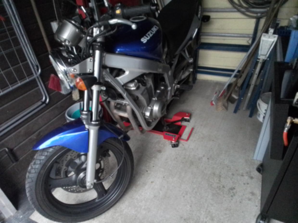 hinten an der Wand oder vorne ging die Tür nicht zu. Auf dem Seitenständer überwintern gefiel mir nicht so. Mit dem Teil kann man das Moped schön in alle Richtungen schieben.