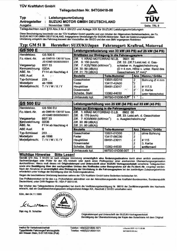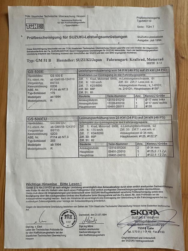 Erkennbar ist das an der Maximalgeschwindigkeit, die liegt bei Baujahr 94/95 bei 175 kmh, während es bei den späteren Baujahren (der Bescheid, den du angehängt hast) 170 kmh sind. Da die FIN bei mir mit 137xxx beginnt, wurde sie entweder falsch entdrosselt oder die Vergaser wurden umgebaut. Erstmals wurde sie im Jahr 2000 entdrosselt und da direkt mit dem Eintrag "offene Ansaugstutzen, 125/122,5 Hauptdüsen. Das passt irgendwie alles nicht zusammen, deswegen bin ich so stutzig. |