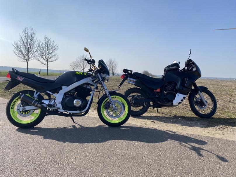 Gestern: Batterie rein, Öl geprüft, Beleuchtung geprüft, Kette geprüft, Bremsen geprüft, Reifenluftdruck angepasst. Rostpickel an der Gabel wegpoliert. Angemacht, lief trotz ausgebliebenem Einmotten schnell sehr gut.