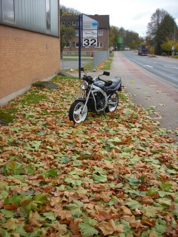 War garnicht so einfach wie gedacht einen ansehnlichen Laubhaufen zu finden, das meiste ist einfach nurnoch braun ubd matschig. Aber ich habe dochnoch was brauchbares gefunden und finde das Foto sieht ganz gut aus, die GS ist auch noch recht sauber und macht einen guten Eindruck Neue Aufgabe: Deine GS vor einem Dixiklo